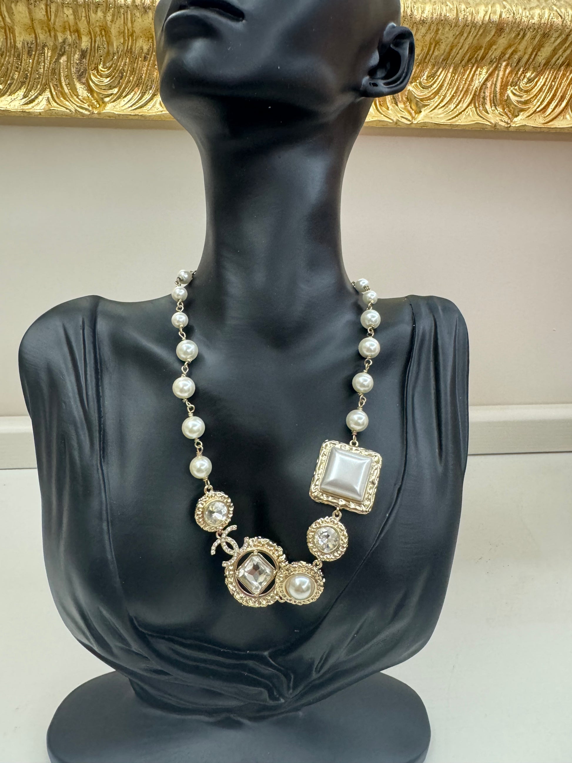Chanel gift vip collana girocollo in perle varie forme. Presenta tutto l’hardware in oro. Ha una CC frontale. Sinonimo di eleganza e raffinatezza.
