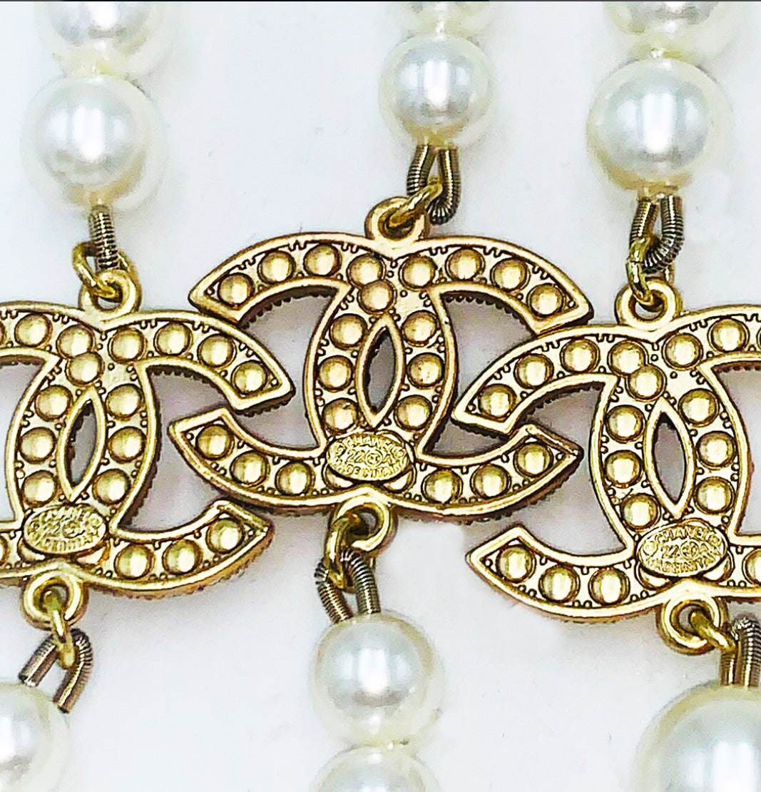 Chanel gift vip collana molto lunga con triplo logo CC con perle di semi e un filo di perle di dimensioni graduate. Tutto in perfette condizioni e inclusa la scatola Chanel dotata di interni in velluto imbottito nero con il nome Chanel.