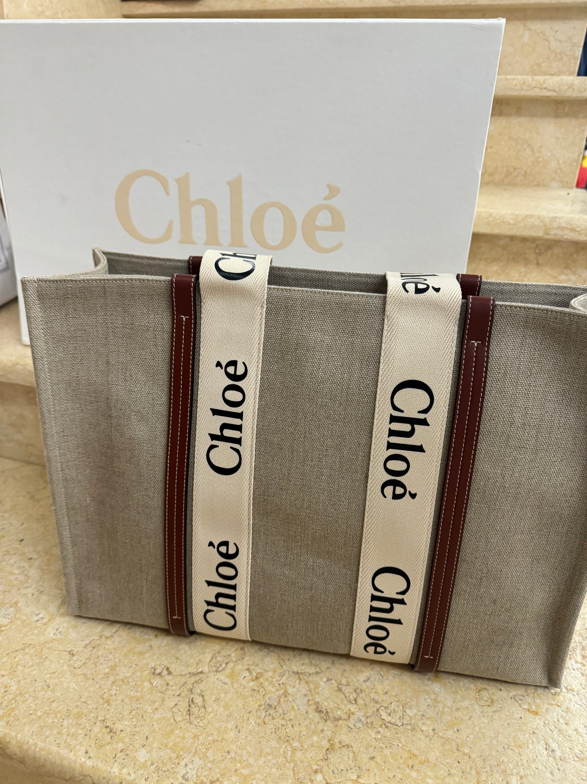 BORSA TOTE "WOODY" CHLOE, IN LINO BEIGE, DETTAGLI IN PELLE LUCIDA MARRONE, DUE MANICI SUPERIORI IN TELA PANNA, DETTAGLIO MOTIVO STAMPA LOGO NERA, UNO SCOMPARTO INTERNO PRINCIPALE, UNA TASCA PIATTA INTERNA.