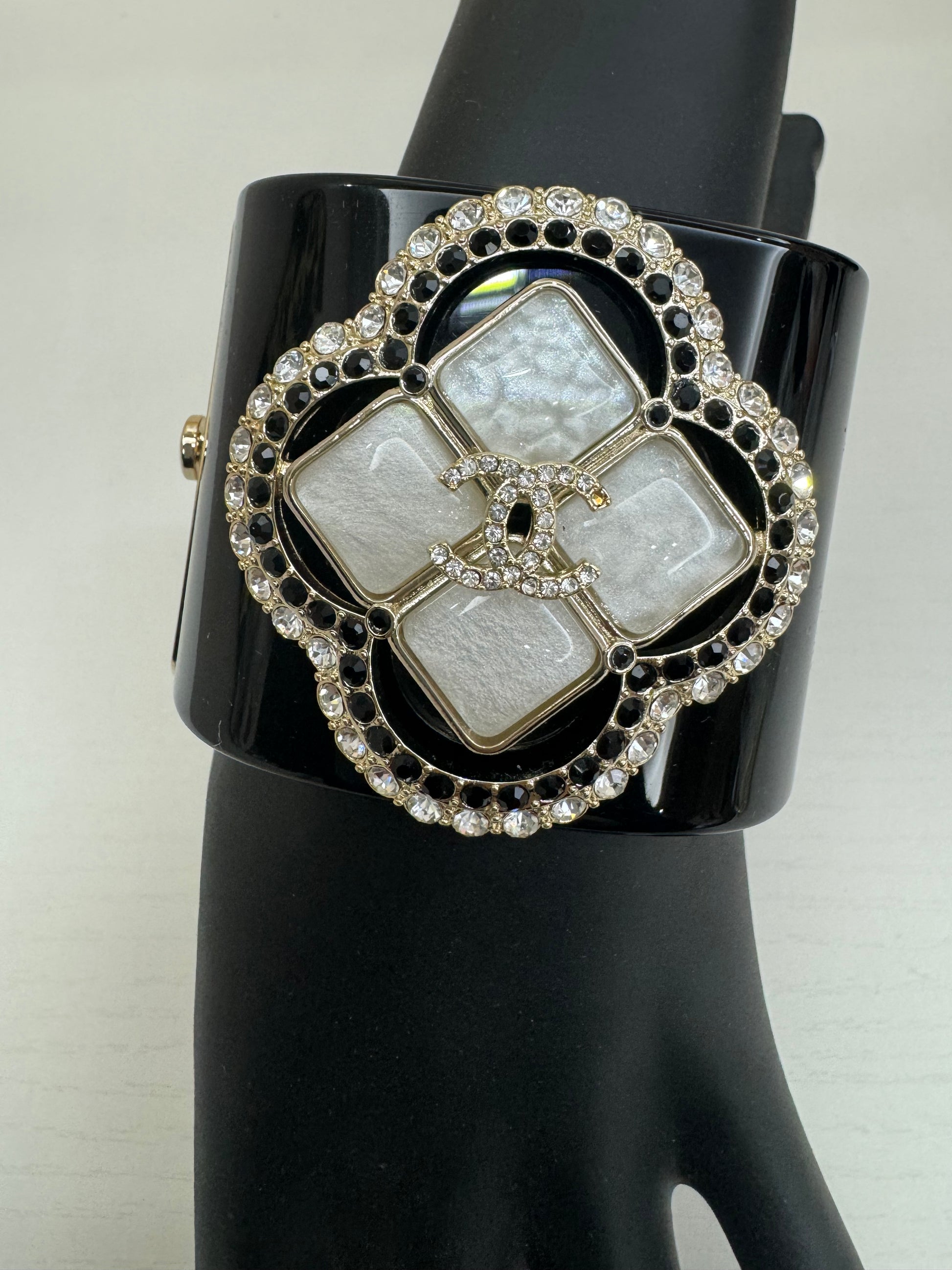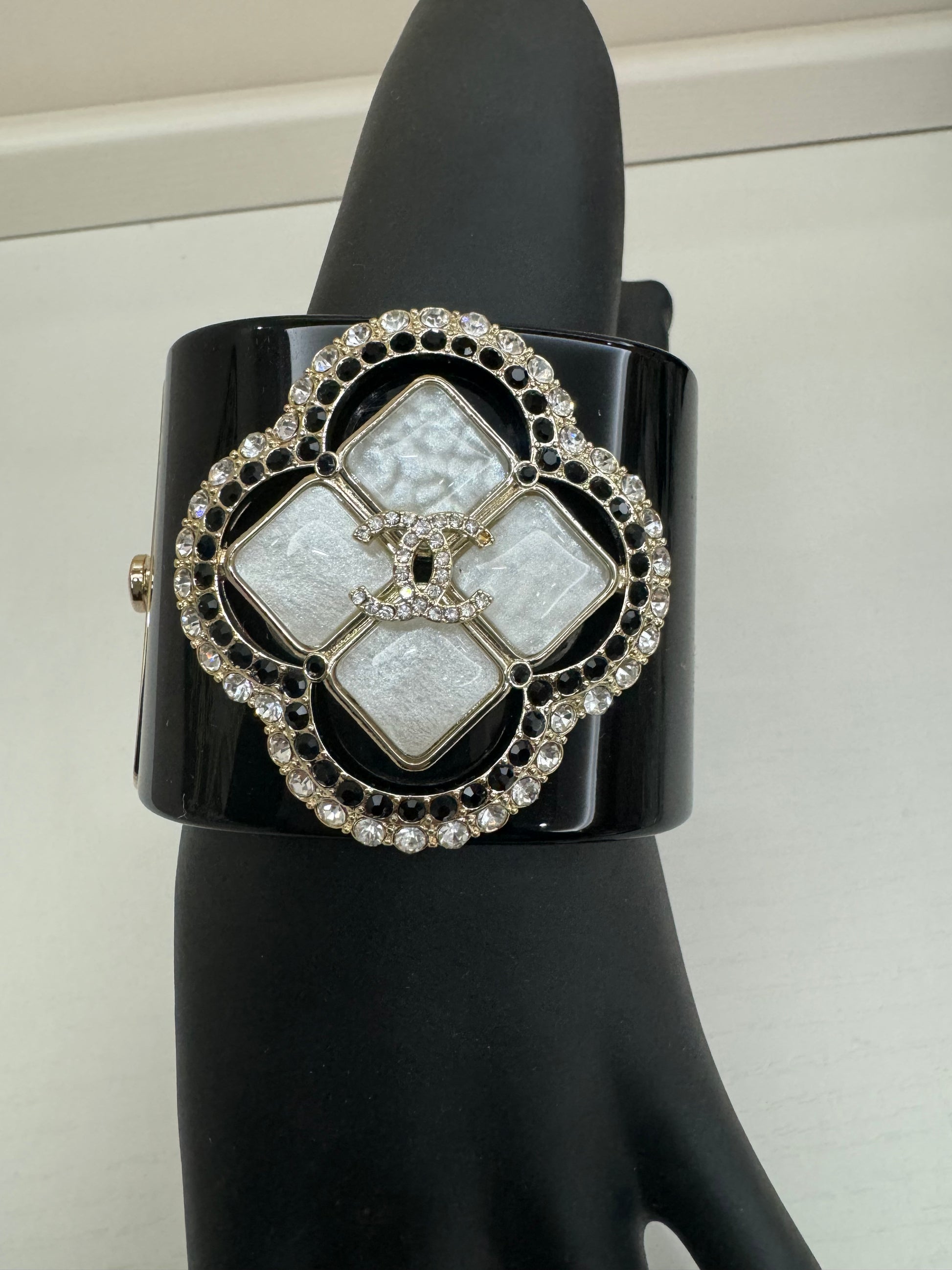 Chanel gift vip bracciale elegante. Presenta l’hardware in colore oro pallido. Frontale CC di strass. Sinonimo di eleganza e raffinatezza.
