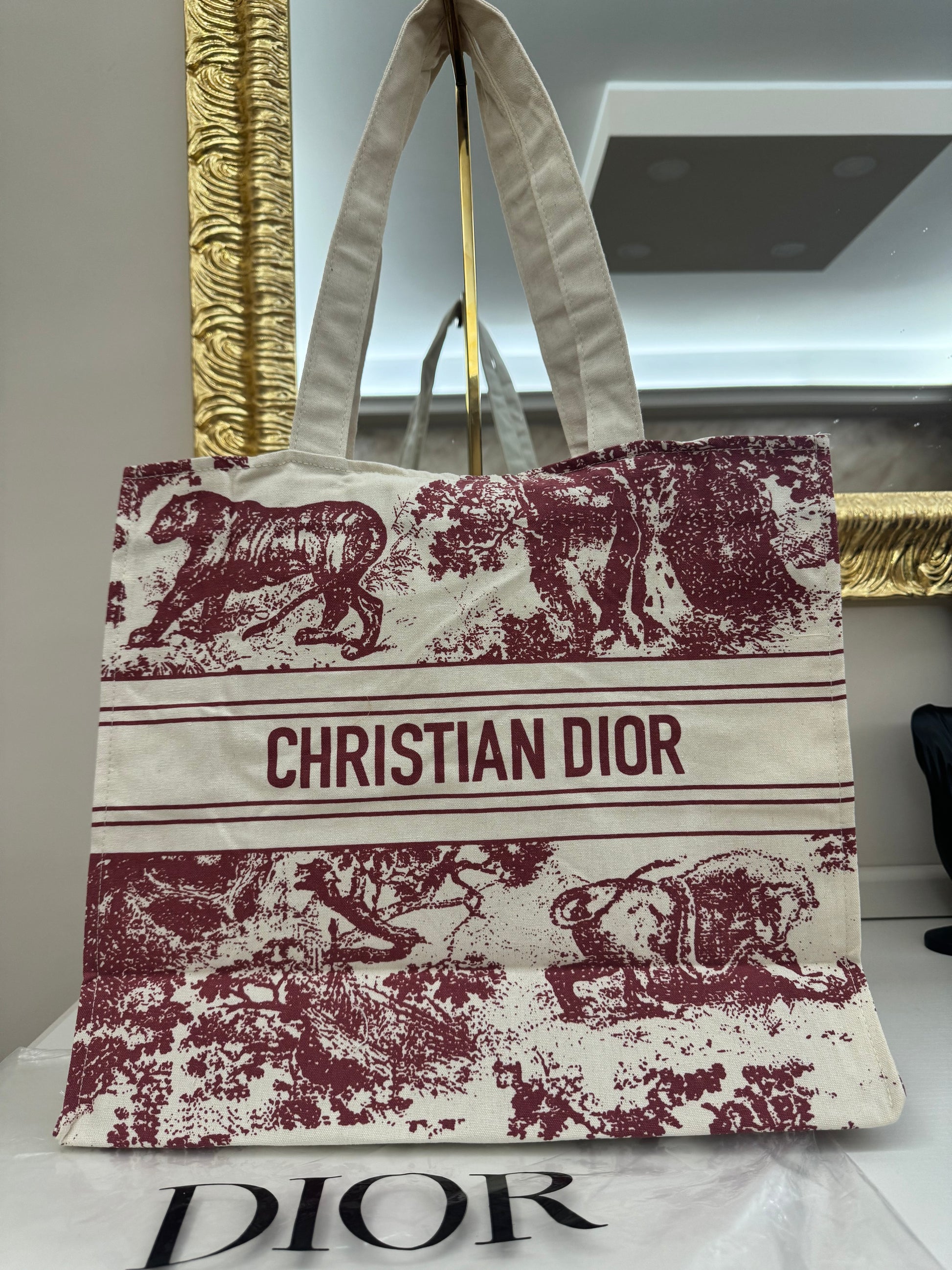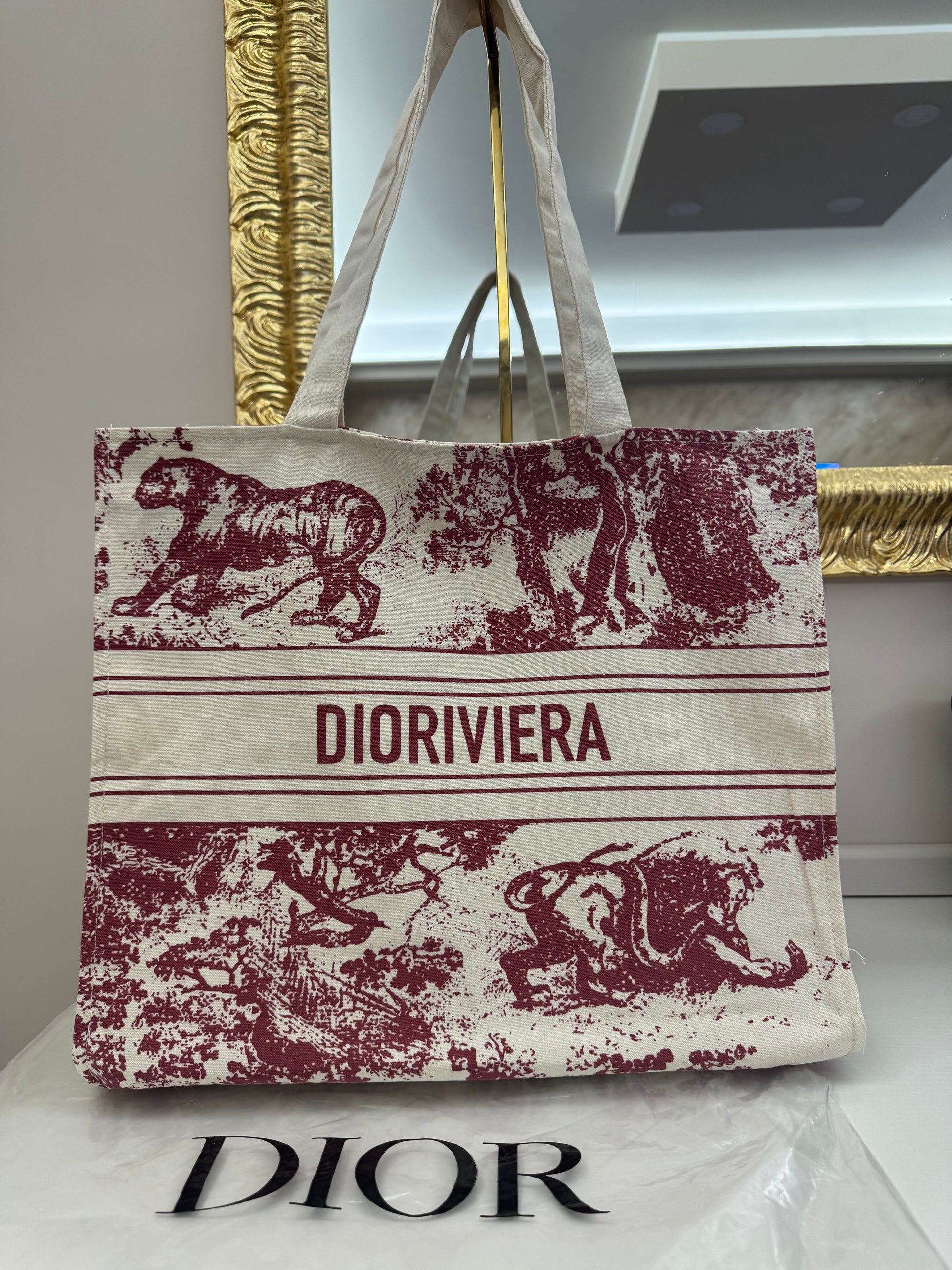 Dior gift dioriviera in tessuto bordeaux. Ideale per le giornate di mare. Molto bella, comoda e capiente. Prettamente estiva. Doppi manici in stoffa da indossare sia a spalla che a braccio che a mano. Presenta frontale da un lato la scritta Christian Dior e nell’altra parte la scritta Dioriviera. Disegni del brand Dior. Con busta Dior