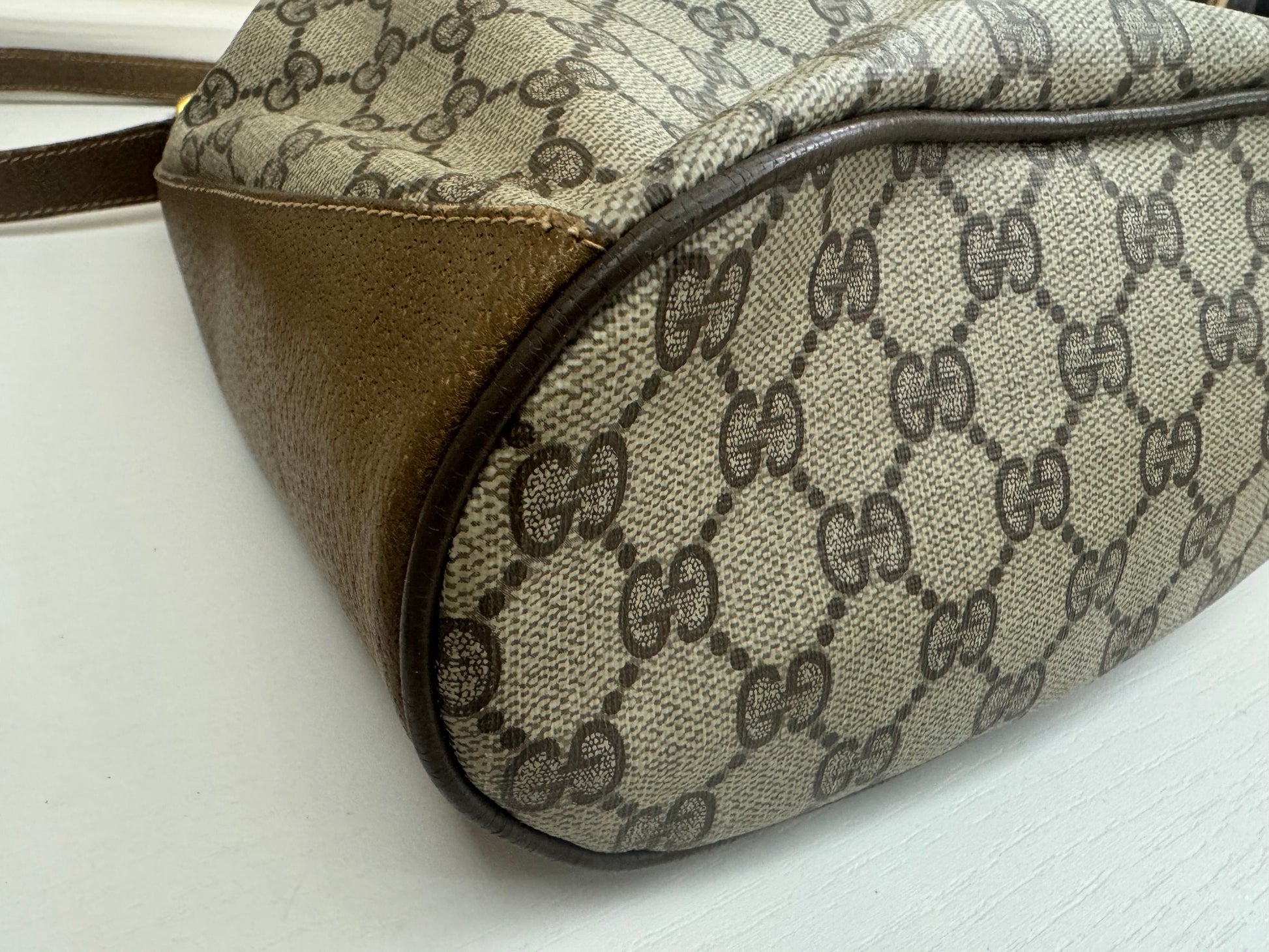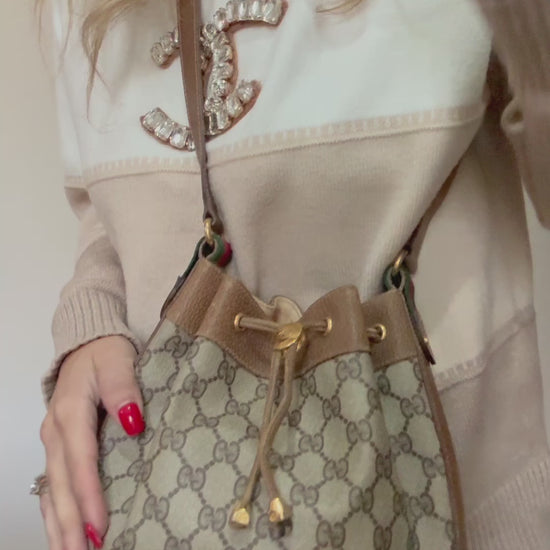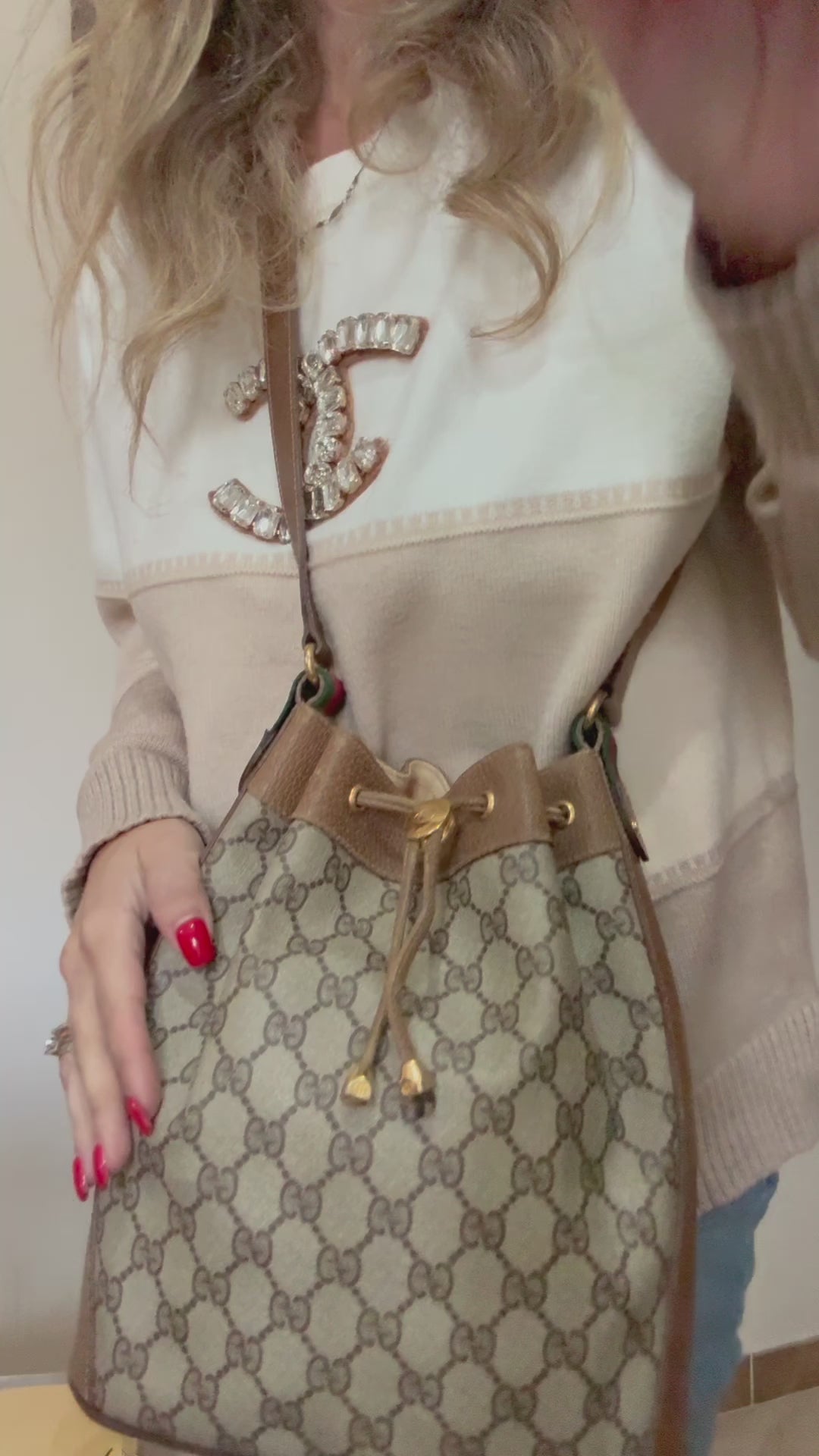 Gucci Ophidia Bucket la tela esterna tutta logata non presenta segni di usura evidenti. Angoli perfetti. Interno macchiato etichetta interna in pelle e dietro ha il suo codice... Nella parte superiore chiusura con laccetto in pelle marrone, sali e scendi colore oro. Tracolla regolabile in pelle e hardware oro.