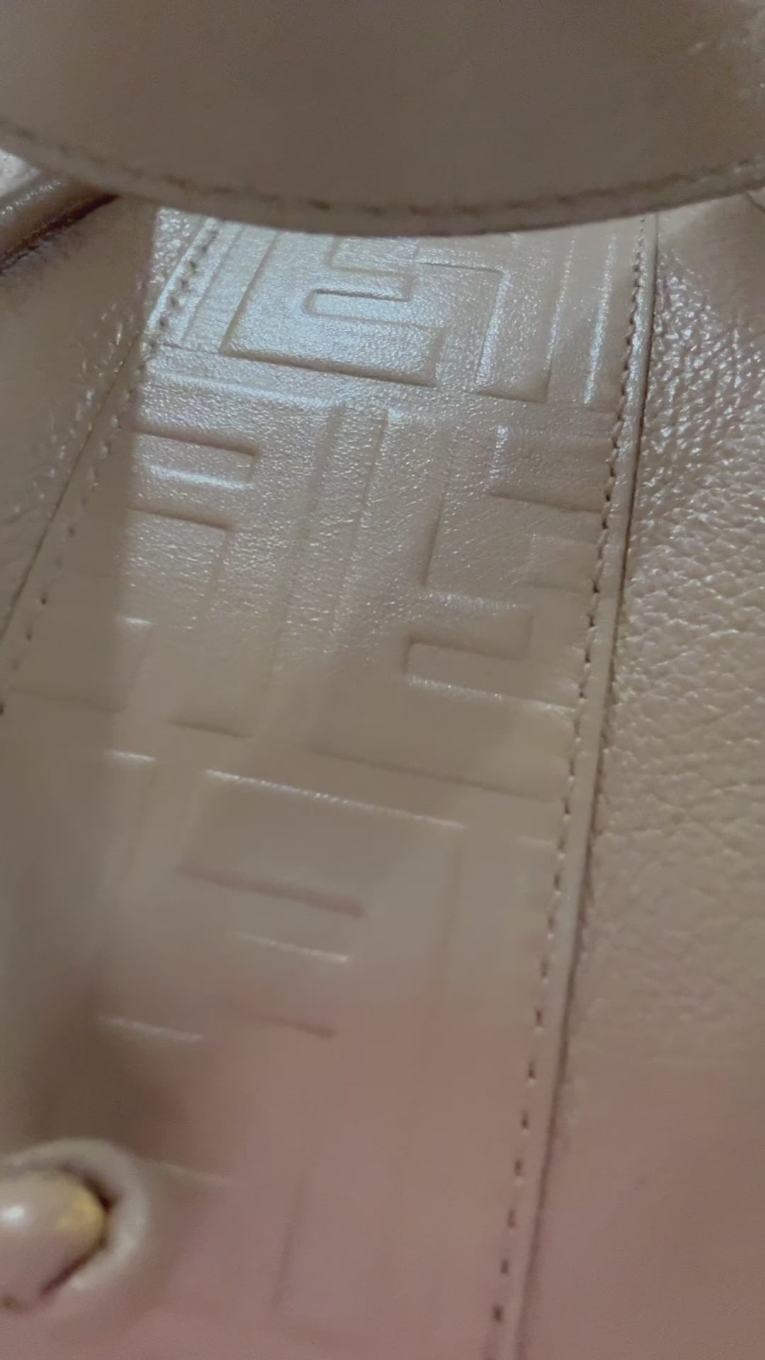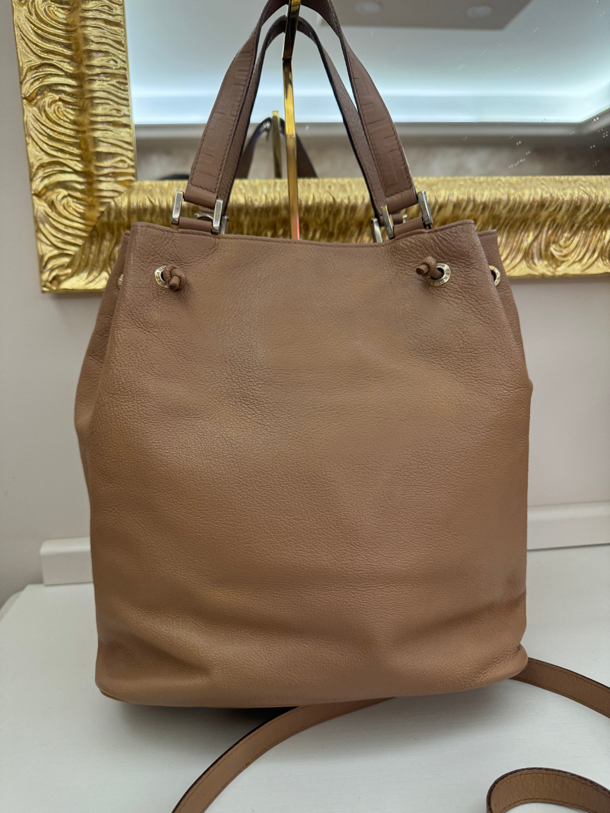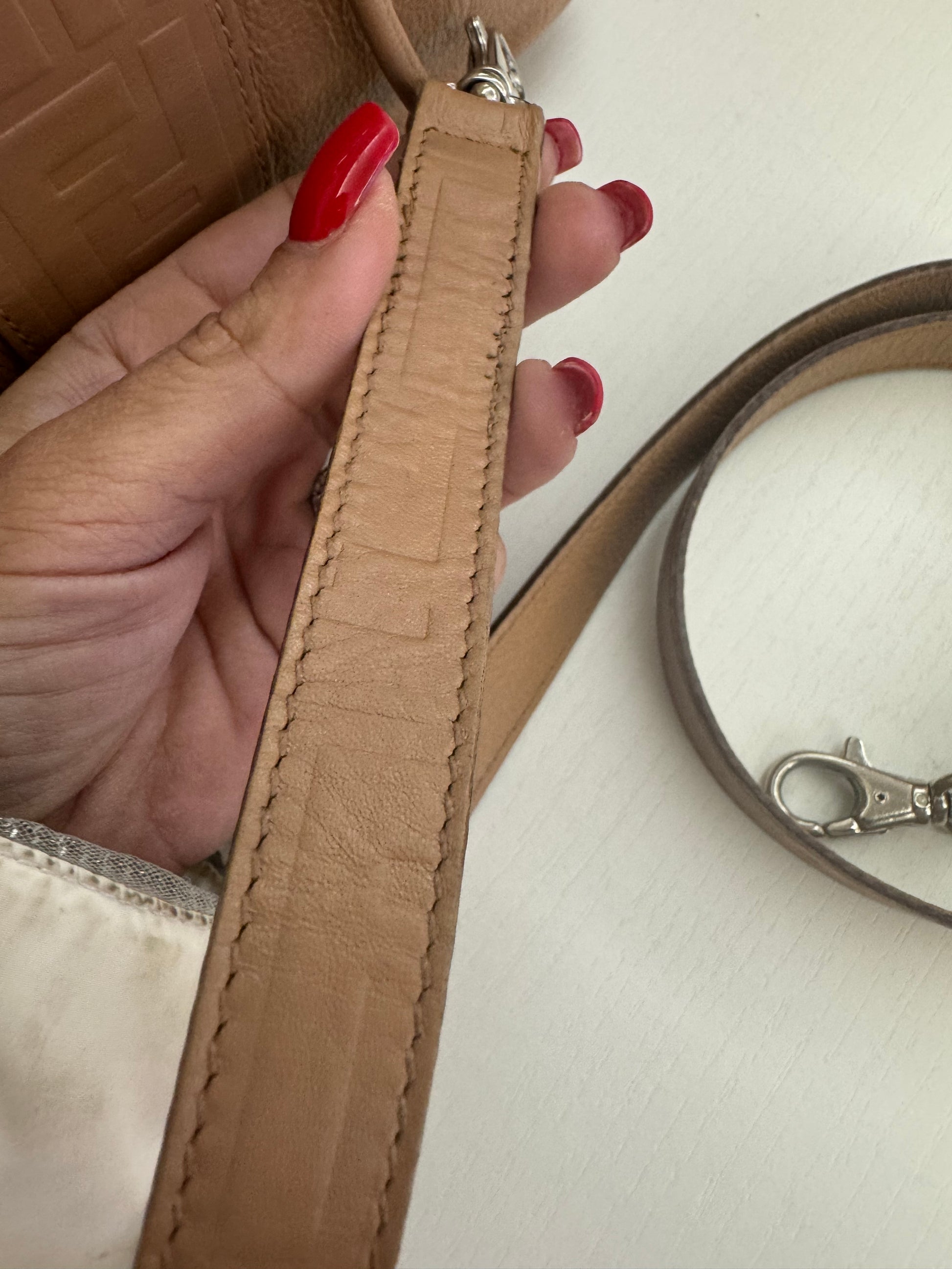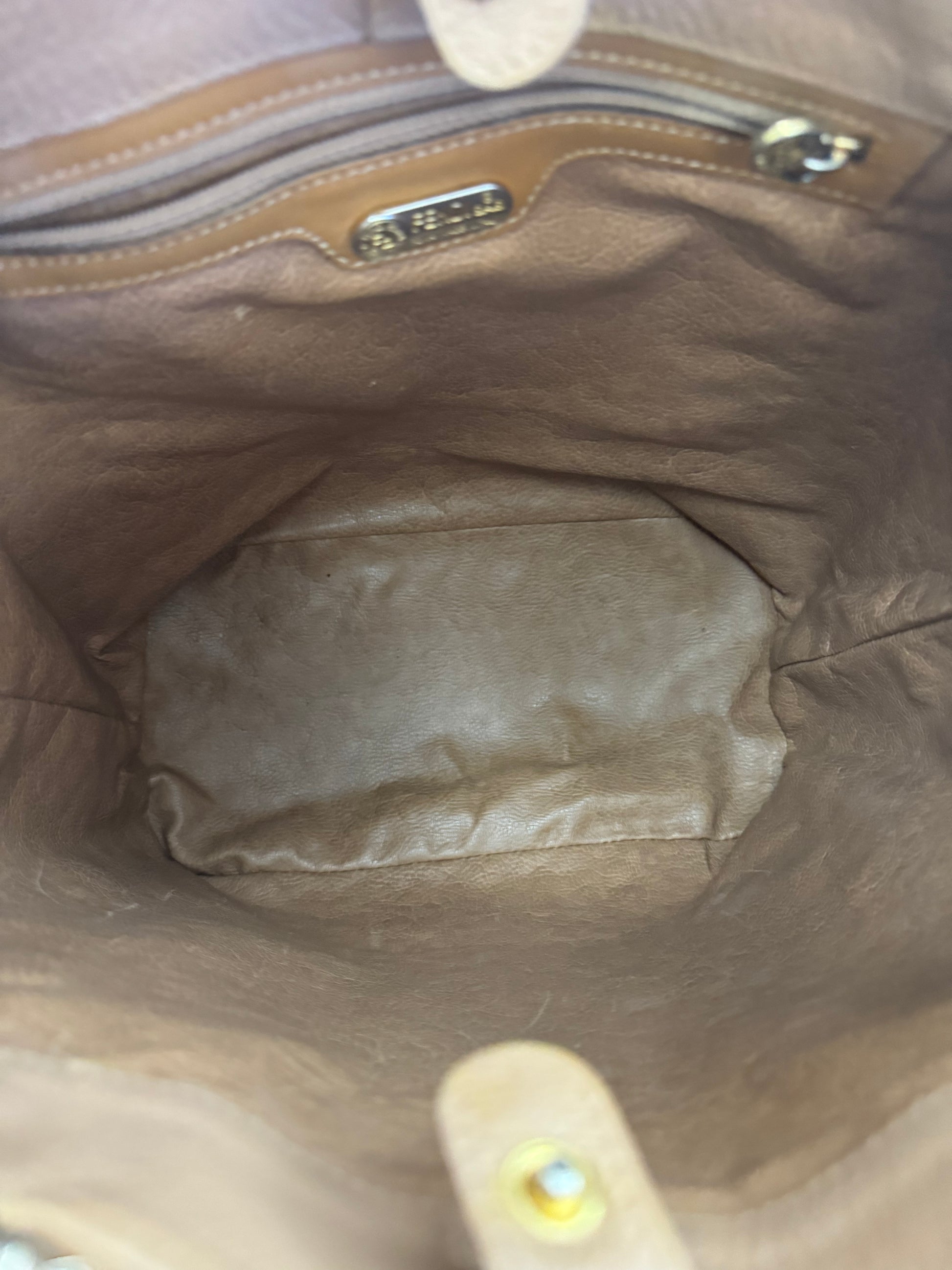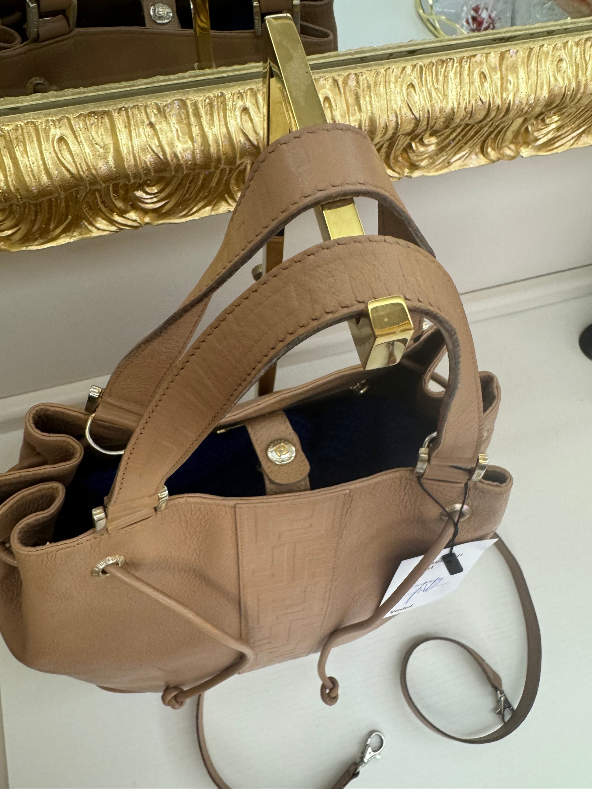 Fendi secchiello vintage in pelle color cammello. Presenta al centro una striscia tutta legata con F in rilievo. Sì presenta in perfette condizioni. Angoli impeccabili non hanno nessun segno di usura. Ha 2 manici per portala o a braccio, a mano o a spalla e in più ha la tracolla per poterla indossare comodamente a tracolla. All’interno taschino con zip e giretto con cursore logato. Hardware tutto dorato e presenza segni di utilizzo. Tracolla rimovibile tutta logata come striscia centrale con F in rilievo. Misure 30x28x12.