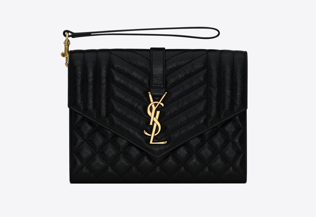 Yves Saint Laurent busta autentica. Presenta l'hardware colore oro. Codice interno. In vera pelle martellata matelassè. Impunture verticali, chevron e rombi. Chiusura a bottone. Cinturino da polso amovibile 14 cm. Fodeta in cotone. Fornita con scatola e dustbag. Dimensioni: 21x16. Nasce come busta da tenere a mano/ polso ma è adattabile catena.